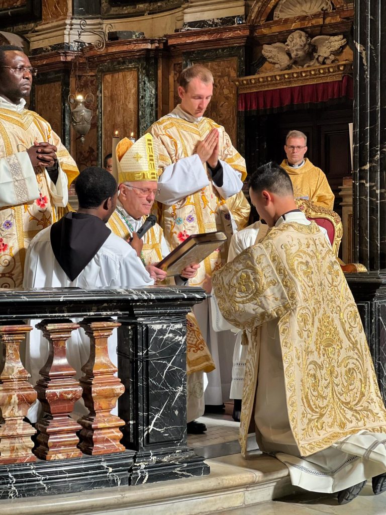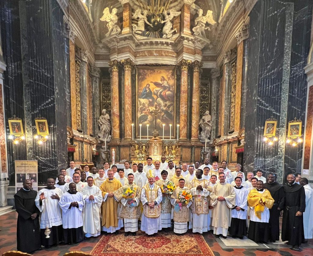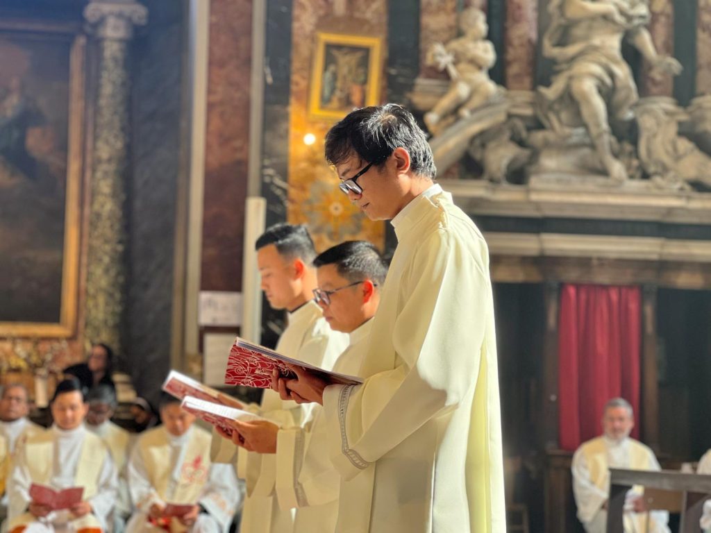 L’11 aprile 2026, presso la Chiesa di Gesù e Maria al Corso – Roma, sono stati ordinati diaconi i confratelli Fra Ephafroditus Fau, Fra Ta Quang Trung e Fra Phan Thanh Vu. La celebrazione, presieduta da Mons. Nunzio Galantino, si è svolta sabato alle ore 16, alla presenza di confratelli e amici che hanno condiviso questo momento di grazia e di festa per tutta la comunità. I nuovi diaconi sono studenti presso lo Studentato Internazionale Fra Luigi Chmel e appartengono alla Provincia asiatica dell’Ordine.