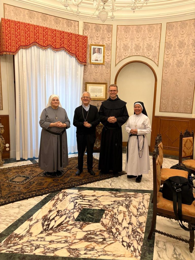 Il 15 ottobre 2025, il Priore generale P. Nei Márcio Simon ha accompagnato Suor Resmay Memorial, filippina, e Suor Serafina Mazza, italiana, in visita al vescovo di Trapani, Mons. Pietro Maria Fragnelli, per un incontro di dialogo e discernimento riguardante la presenza e le prospettive future delle Suore Agostiniane Scalze nella diocesi di Trapani. L’incontro ha permesso di affrontare diversi temi legati alla vita e alla missione dell’Istituto, riconosciuto di diritto diocesano, che negli ultimi anni ha conosciuto una significativa crescita, soprattutto in Asia.